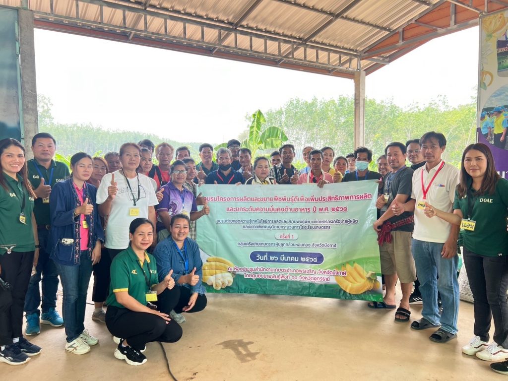 วันที่ 26 มีนาคม 2568 ศูนย์ขยายพันธุ์พืชที่ 10 จังหวัดอุดรธานี จัดฝึกอบรมเครือข่ายเกษตรกรผู้ผลิตและขยายพืชพันธุ์ดี ครั้งที่ 1 หลักสูตร การปลูกและขยายพันธุ์กล้วยหอมทองพันธุ์ดี ตามโครงการผลิตและขยายพืชพันธุ์ดีเพื่อเพิ่มประสิทธิภาพการผลิตและยกระดับความมั่นคงด้านอาหาร ปี พ.ศ. 2568 ให้กับกลุ่มเครือข่ายเกษตรกรผู้ปลูกกล้วยหอมทอง จังหวัดบึงกาฬ ณ วิสาหกิจกล้วยหอมทอง BK77 ตำบลหนองหัวช้าง อำเภอพรเจริญ จังหวัดบึงกาฬ ลิงค์เพิ่มเติม